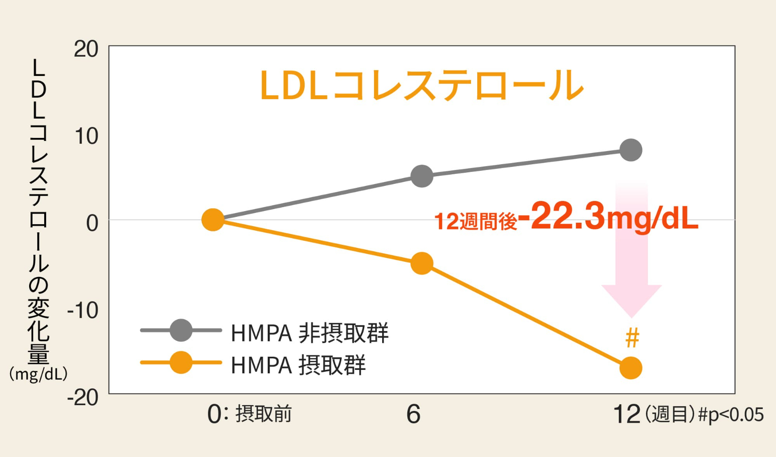 総コレステロール 【試験食品】 HMPA摂取群: HMPA23mg/日を含むカプセル。HMPA非摂取群: 外見が同一でHMPAを含まないカプセル 【摂取期間】 12週間 【出典】 Jpn Pharmacol