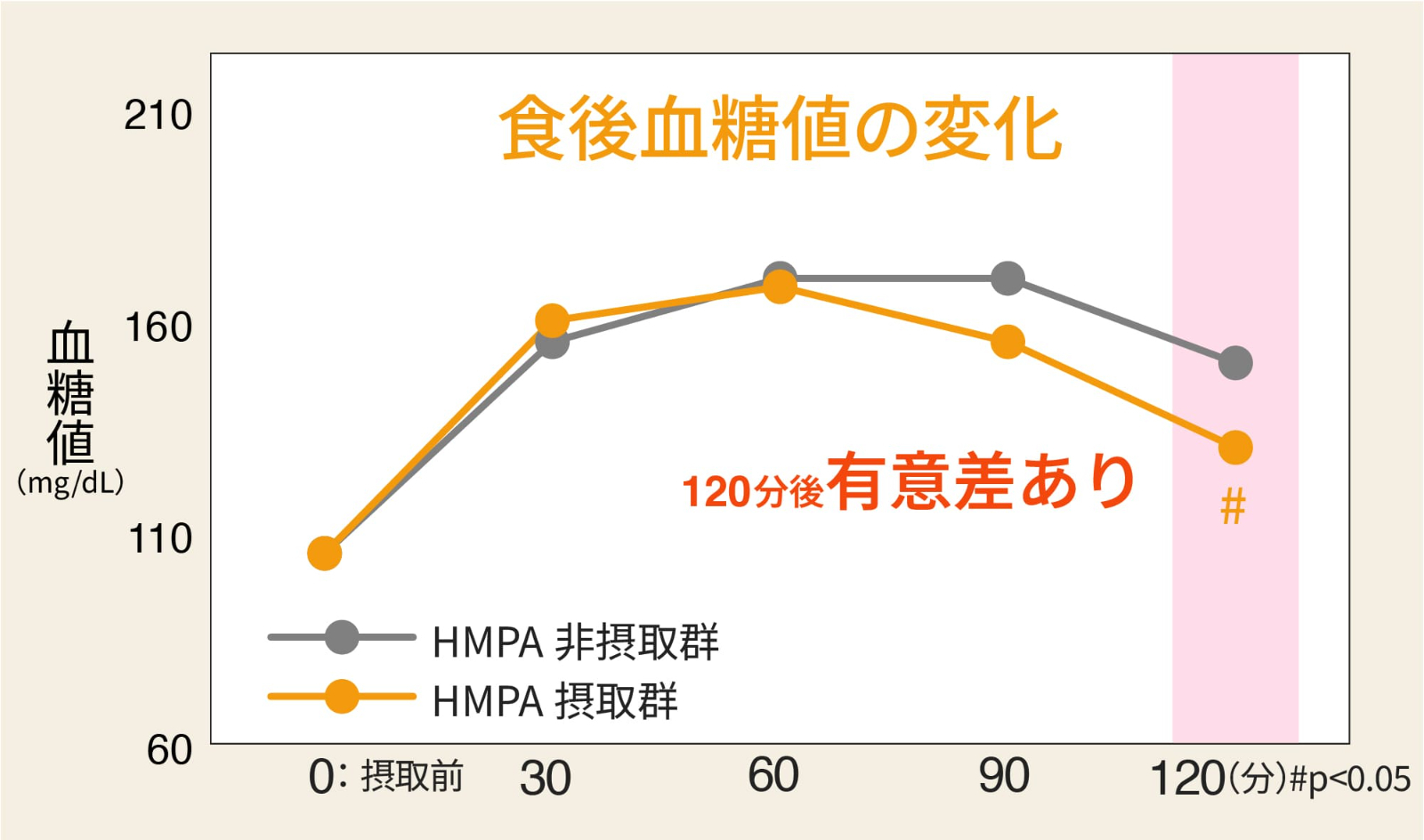糖負荷検査(OGTT)による血糖値 【試験食品】 HMPA摂取:HMPA23mgを含むカプセル HMPA非摂取:外見が同一でHMPAを含まないカプセル 【摂取期間】 4週間 【出典】 Jpn Pharmacol