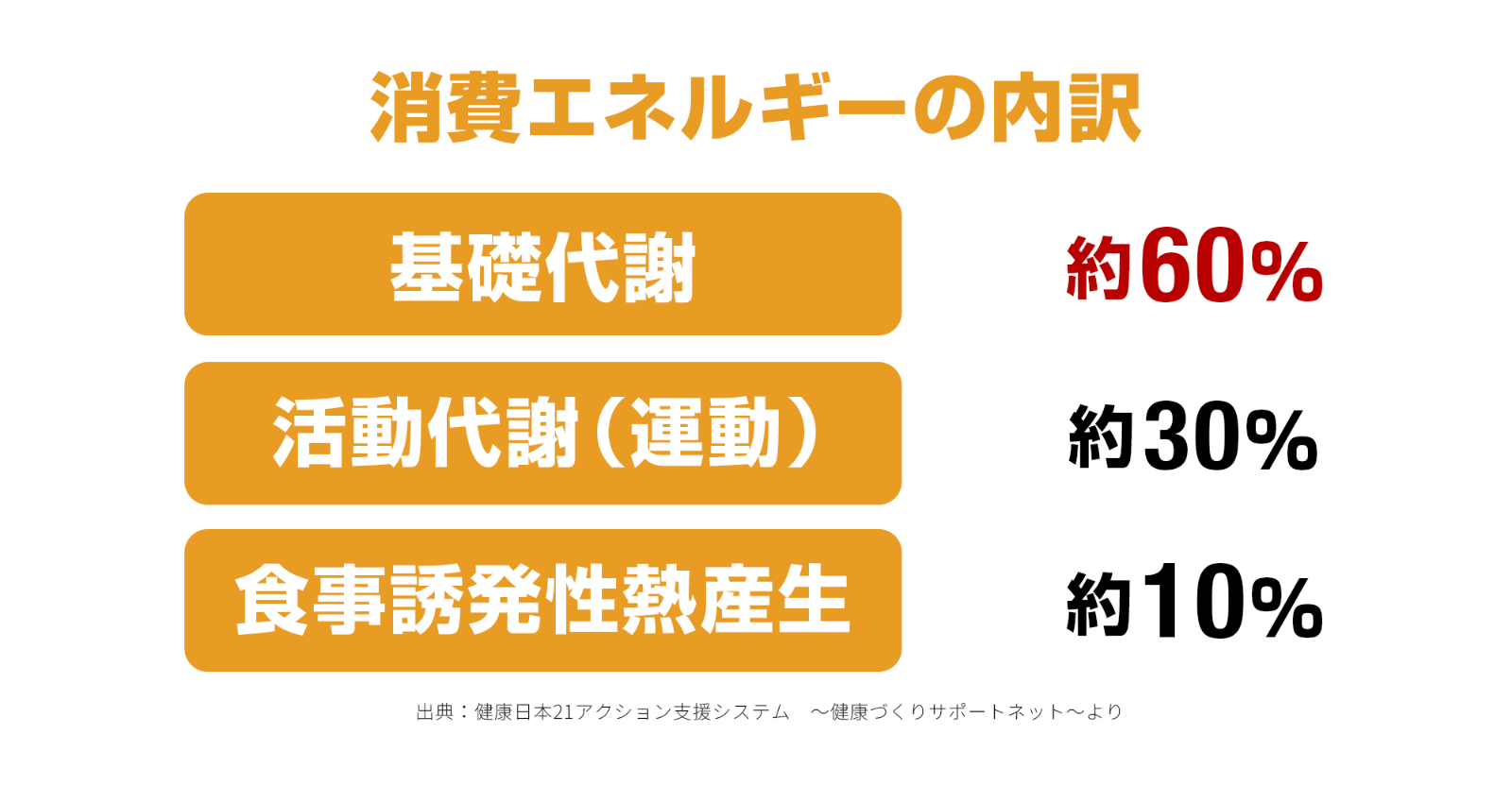 基礎代謝は、呼吸や体温維持など、生きているだけで使うエネルギーのことですが、実は消費カロリーの約6割が基礎代謝で消費されます。